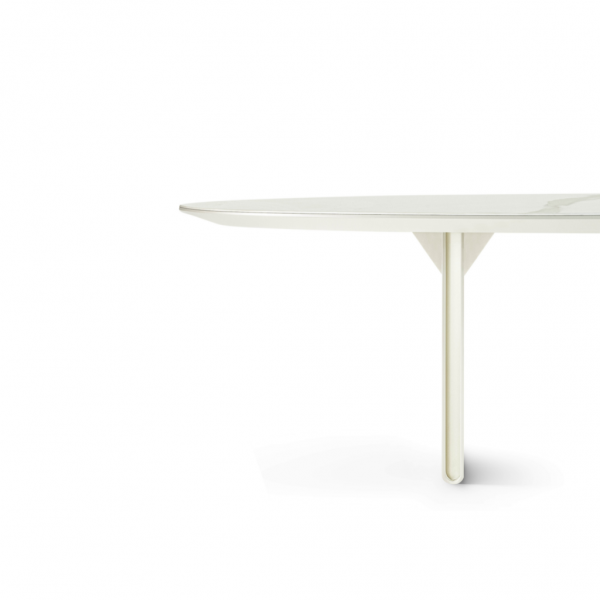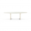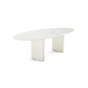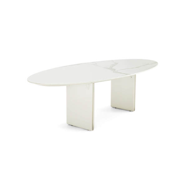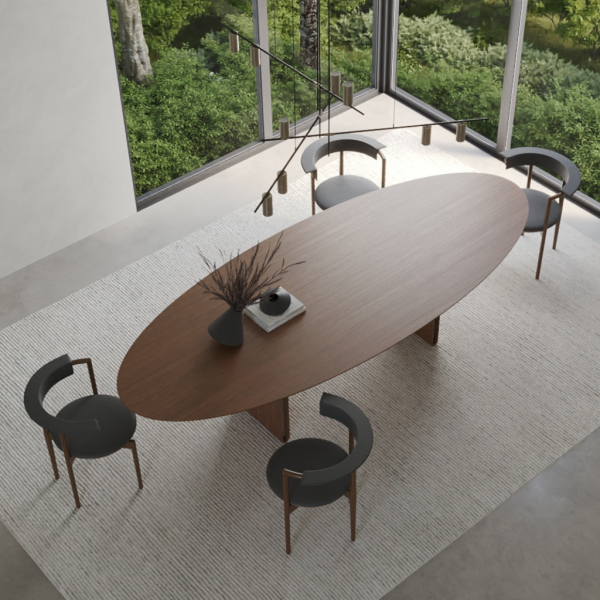 A mesa de jantar Guanabara destaca-se pela sofisticação estética. Seu tampo oval é sustentado por duas colunas robustas com reforço em aço carbono, revestidas em lâminas de madeira natural ou acabamento laqueado. O grande diferencial está no detalhe interno das laterais em alumínio, que pode receber polimento e pintura metalizada, lâmina ou laca, conferindo personalidade e elegância à peça. Para completar, o tampo oferece três possibilidades de acabamento, valorizando ainda mais o caráter imponente e contemporâneo do design.