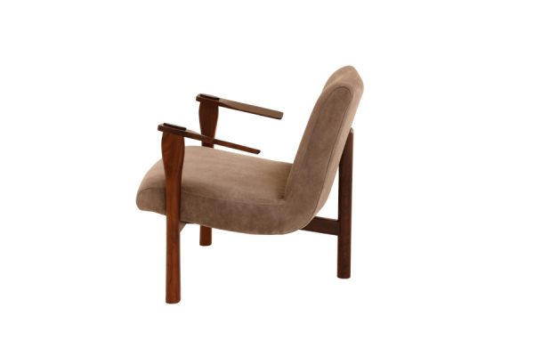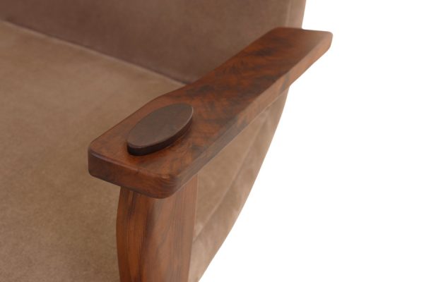 A poltrona combina design sofisticado e conforto. Com estrutura de três pés em madeira maciça e estofamento em tecido, a peça destaca-se pela elegância e pela exclusividade de suas formas. O traço autoral do designer, conhecido por sua atenção aos detalhes, torna esta poltrona uma escolha perfeita para ambientes sofisticados e contemporâneos.