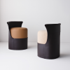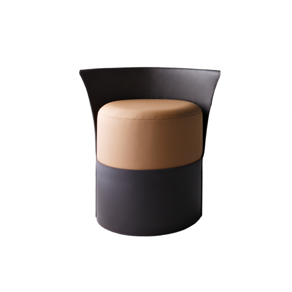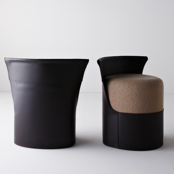 O desenho valoriza o contraste entre o volume macio do estofado e a superfície firme do couro, resultando em uma peça compacta e de presença marcante.